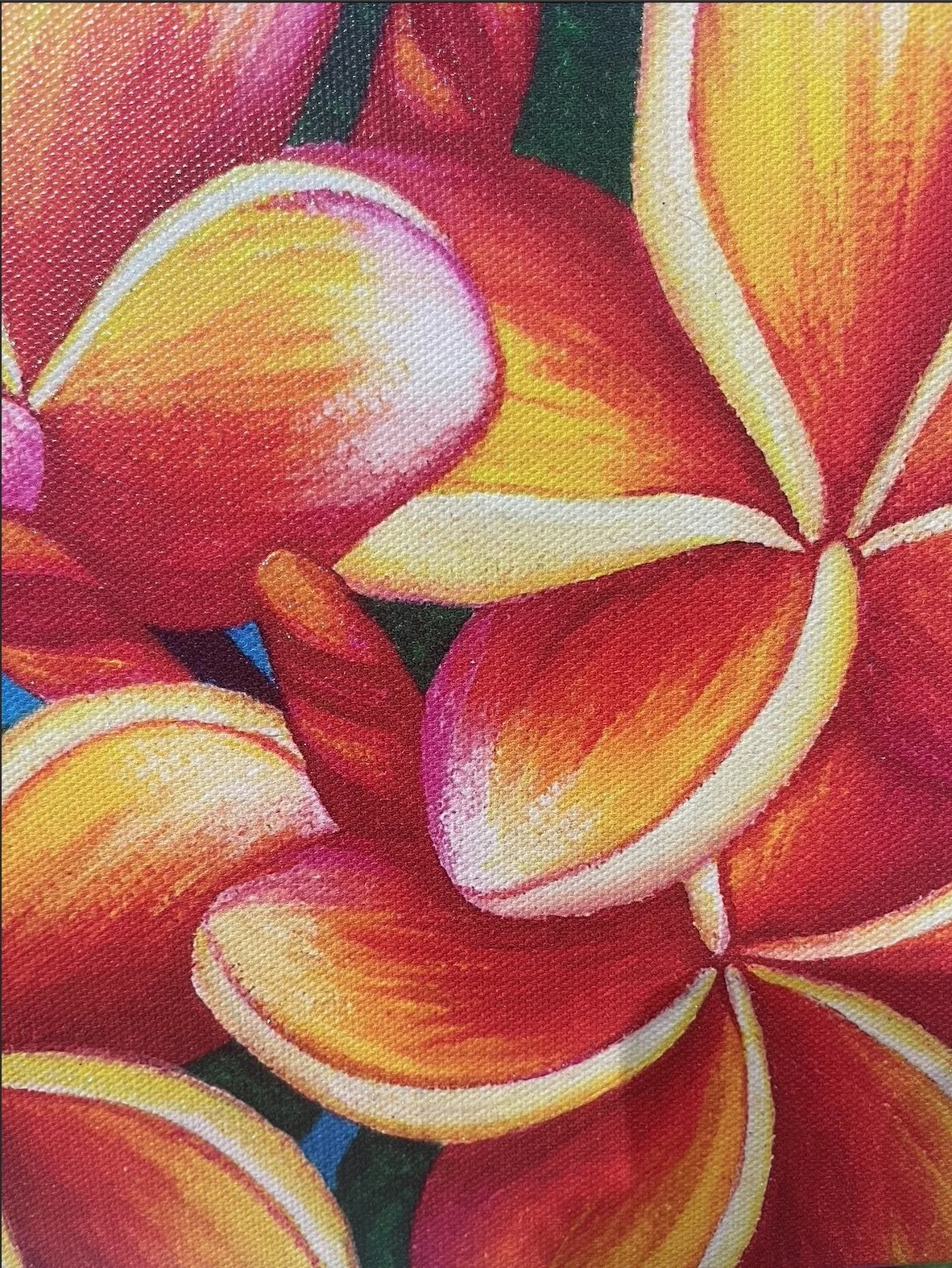The painting is by Stephanie Boinay, and I saw it at the Aesthetic Hawaii Gallery in Kailua. I was really drawn to it because I love flowers—especially plumerias and hibiscus. I also love sunsets, and this painting felt like a perfect blend of both, with colors that reminded me of a plumeria and the warmth of a sunset.
